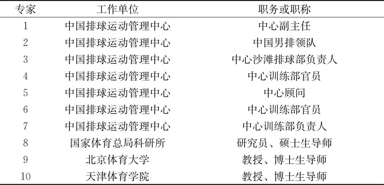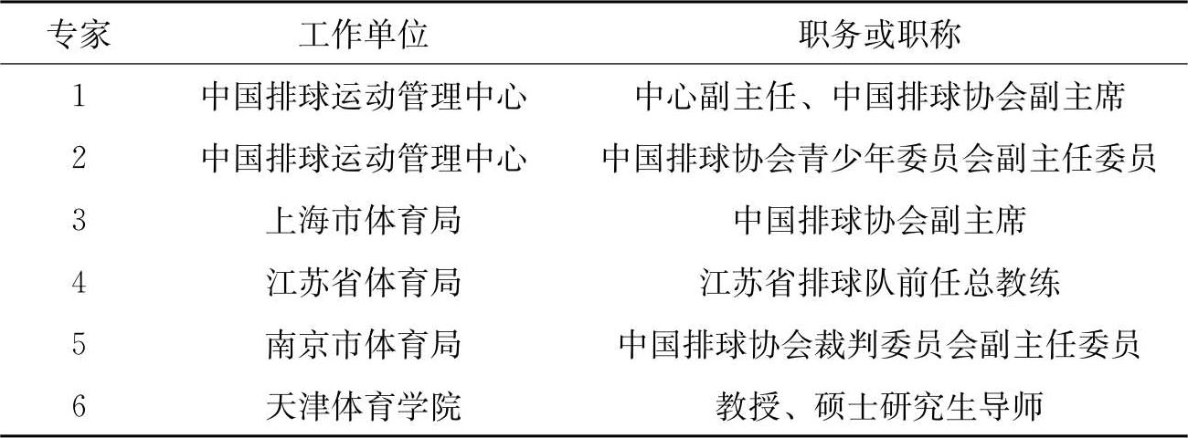 。本研究就排球运动改革和发展过程中所面临的一些重要问题,采用无结构式访问,于2001年9月中下旬和2002年11月初,对中国排球界的6位专家(表1-1)进行了两次集中的当面访谈,获得了大量有价值的信息和富有启迪性的见解,加深了对中国排球运动可持续发展问题的理解。