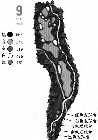 就一个球道而言,从发球区到球洞的长度为该球道的距离,以米或码为单位。一般长度在 230米(250码)以内的球道,称为短球道,标准杆数为 3杆(所谓的标准杆就是球员根据设计应当完成的杆数。即从发球区开球到将球打进球洞,所打的杆数应为 3杆);长度在 230~430米(251~470码)的称为中距离球道,标准杆数为 4杆;长度在 431米(471码)以上的称为长球道,标准杆数为 5杆。(图 2-2-2)