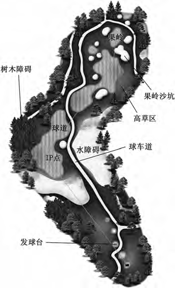 球手站在发球台上,以能看清楚果岭上旗杆底部最为理想。从击球点向果岭上远望,整个球道富有变化,增添了挥杆的乐趣。球道上的标准击球点(IP点)是设计师为球手设计的较理想的落球和击球的区域,一般比较平坦,利于击球和攻击下一个目标。以标准的击球距离为准,一般第一个标准击球点是在距离发球台 220米的位置,第二个击球点是在距发球台 420米的位置。球道的左右曲折和高低起伏也是一种障碍,可以考验球手落球的准确性,球落在正确地点就容易被打上果岭,否则,就会增加难度,甚至受到惩罚。狗腿洞、双狗腿洞的击球线路呈曲线。球道两侧的深草、草丛和树林叫做粗糙地带,此处击球难度较大,而周围的沙坑、水塘、小溪则是最不理想的地带,击球非常困难,被称为障碍地带。它们的设置主要是为了增加运动难度和趣味性(图 2-2-3)。