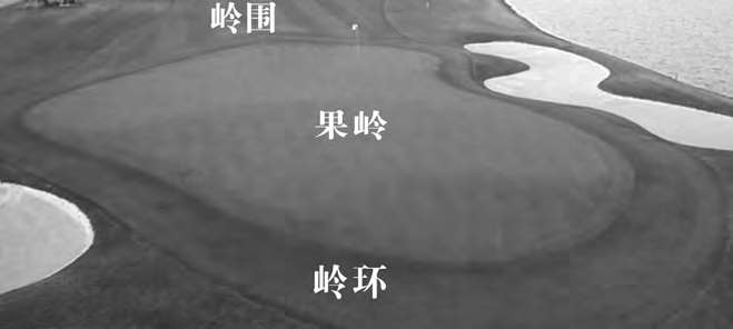 果岭区由果岭推杆区、岭环、岭围及岭周区组成。果岭推杆区即推杆果岭,就是一般意义上的果岭,球洞位于其上,推杆在该区进行。这里的草坪修剪高度最低,一般在 3~6毫米。岭环是指推杆区外围绕推杆区的一个较窄的环形区,其草坪修剪高度介于球道与推杆区之间,宽度为 0.9~1.5米。位于岭环前方,连接岭环和球道的区域称做岭围,它实际是球道的延伸,其草坪修剪高度与球道相同。位于岭环两侧及后缘的岭环之外的区域称为果岭周区,在管理上与次级高草区相似,一般被看做是高草区的一部分。在岭围及果岭周区内可以设有沙坑。(图 2-2-4)