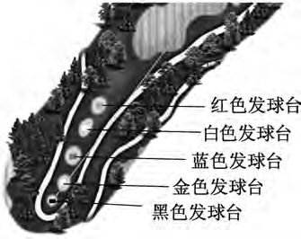 发球台是每个洞打球的起点和开球的草坪区域,是每个洞不可缺少的组成部分之一,它略高于球道表面,为平台式或阶梯状的修理平整的较细的草皮。每个球道一般设有 3~5个发球台,以供不同水平的球员使用。两个发球台之间的距离一般在 25~35码。球员开球时一般将一支球座安插在平整的草坪上,把高尔夫球放在球座上,然后用球杆将球击出。(图 2-2-1)
