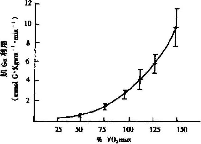 肌糖原的消耗和运动的强度和持续时间有关。当以约30%、60%最大摄氧量运动时,运动1h肌糖原线性减少;以75%最大摄氧量运动1h,肌糖原大量被消耗,以90%最大摄氧量运动25min和以120%最大摄氧量运动5min便筋疲力尽,但肌肉中仍有肌糖原,可见以60%~80%最大摄氧量长时间运动时,肌糖原消耗最大。肌糖原的数量和这时的运动能力密切相关,肌糖原贮量高者,保持速度耐力的时间较长,肌糖原贮量少者,速度耐力下降就快。肌糖原排空存在着肌纤维类型不同之间的特异性差别,在进行长时间耐力运动时慢型Ⅰ和快型Ⅱ肌纤维中糖原先排空,以后快型Ⅱ肌纤维也被募集而显示出最快速度的糖原排空。