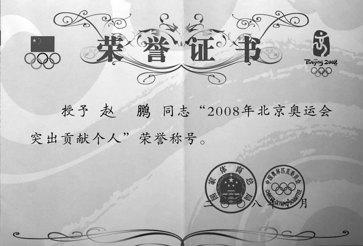 图2:赵鹏被国家体育总局和中国奥林匹克委员会授予“2008年北京奥运会突出贡献个人”荣誉称号。