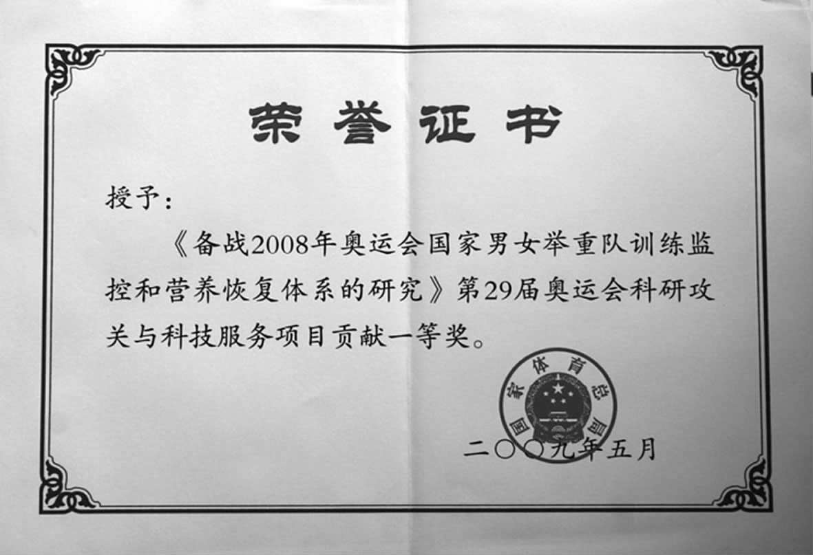 图1:“备战2008 年奥运会国家男女举重队训练监控和营养恢复体系研究”被国家体育总局授予“第29 届奥运会科研攻关与科技服务项目贡献一等奖”。