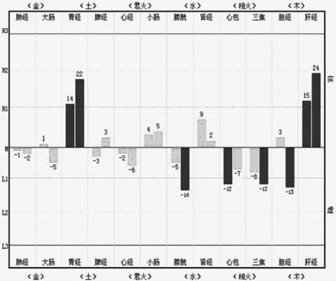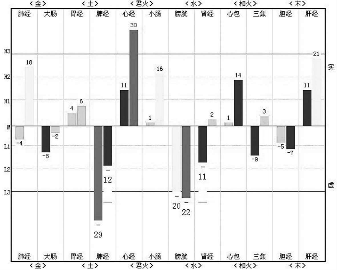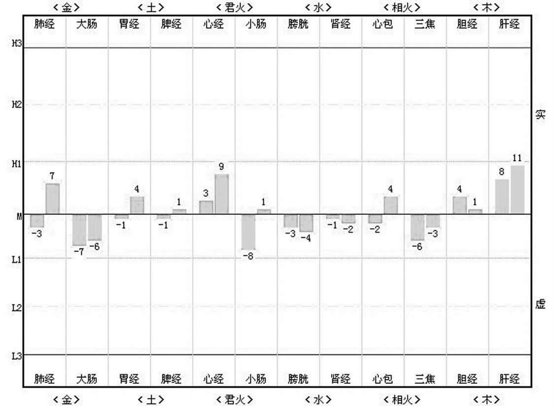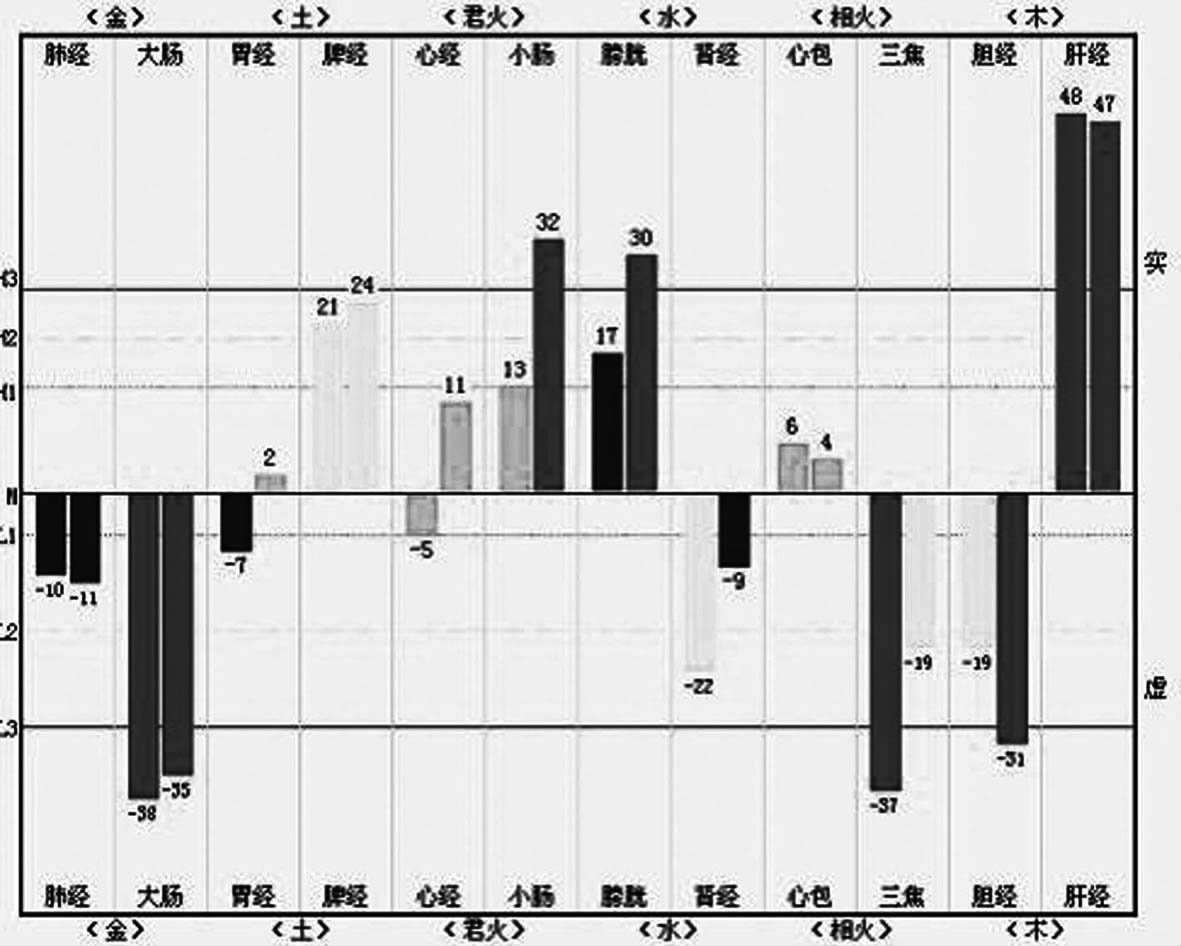 但是,当从全营养辨证施膳角度寻求解决方法,从中医学分析每餐应以哪些食物来提供食物的性(升、降、沉、浮)、气(寒、热、温、凉、平)、味(酸涩、甘淡、苦、辛、咸)、色(白、黄、绿、黑、红),才会对人体经脉脏腑血气营卫提供恰当的滋补,进而根据年龄、体质、职业、季节等因素对食物的性、气、味、色进行辨证摄取,就能实现个体的营养均衡,就能将人的体质调理的更理想(如图1-3、图1-4,人体各经络的导电性比较平衡)。