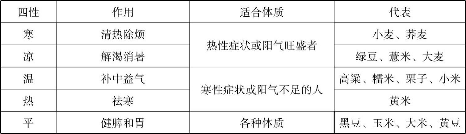 表1-2 五谷杂粮的四性、功能、适应证对应表