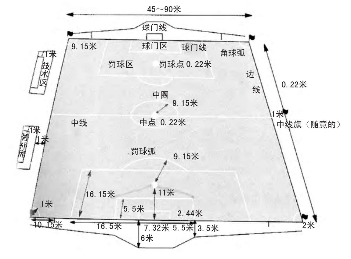 比赛场地必须为长方形,长90~120米,宽45~90米(国际比赛长100~110米,宽64~75米)。非正规比赛场地可因地制宜,但在任何情况下,长度必须超过宽度。
