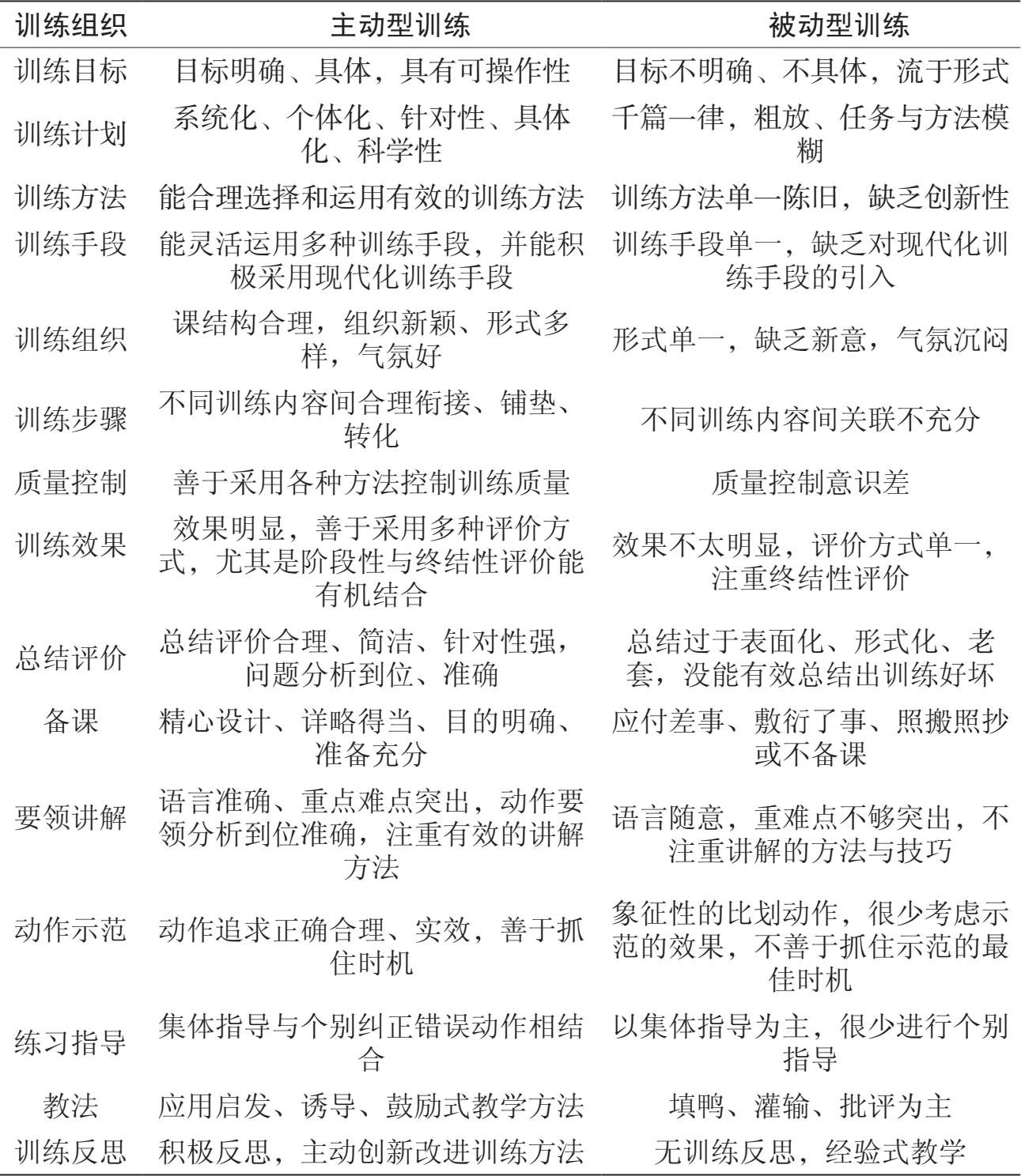 表4-1 训练过程中教练员主动性与被动性的具体体现