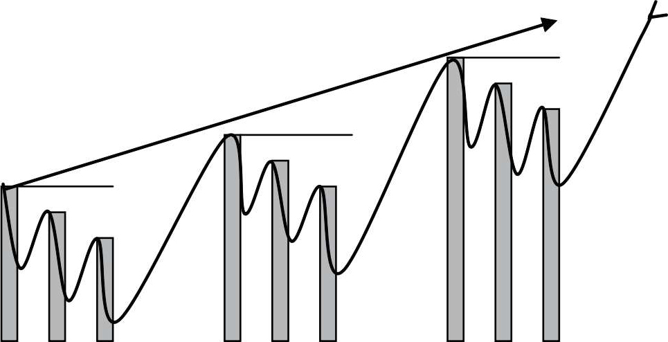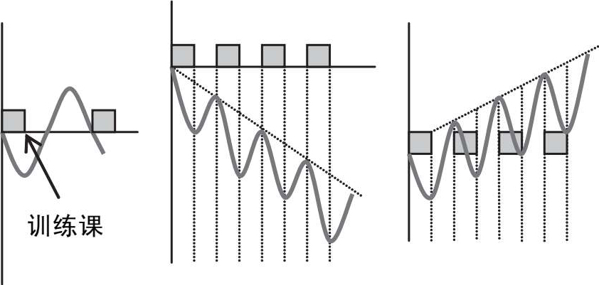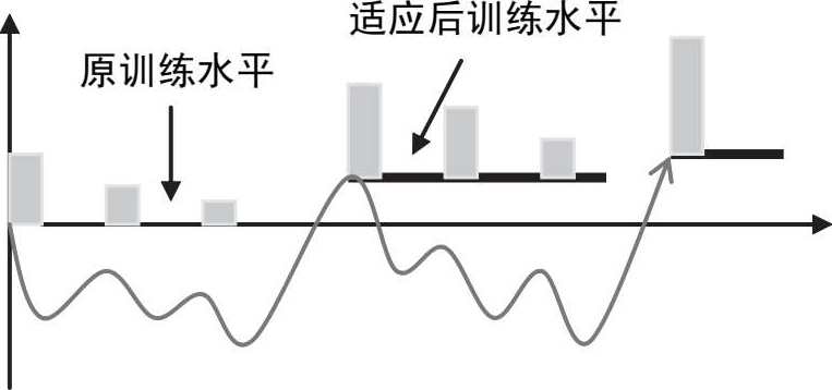为此,我们应该换个角度来思考关于超量恢复理论的有关问题,如该理论的科学性、局限性,如何解读该理论所蕴含的科学化训练价值及在训练实践中应用该理论的科学精髓合理设计训练负荷,追求训练质量效果最大化。其实关于该理论的科学性已经无庸置疑,因为其是基于若干科学实验研究结果提炼出来的理论,并已经经过无数的实践检验证实其应用价值且为广大教练员所接受,如训练小周期、中周期及赛前竞技状态调控模式中的训练负荷的波动性设计正是基于该理论“基石”而进行的,正是这种训练负荷的周期性波动设计才保证我们训练计划的系统执行并取得较为积极的训练效果,如图6-3所示的数次不全恢复性训练累积超量恢复效果。