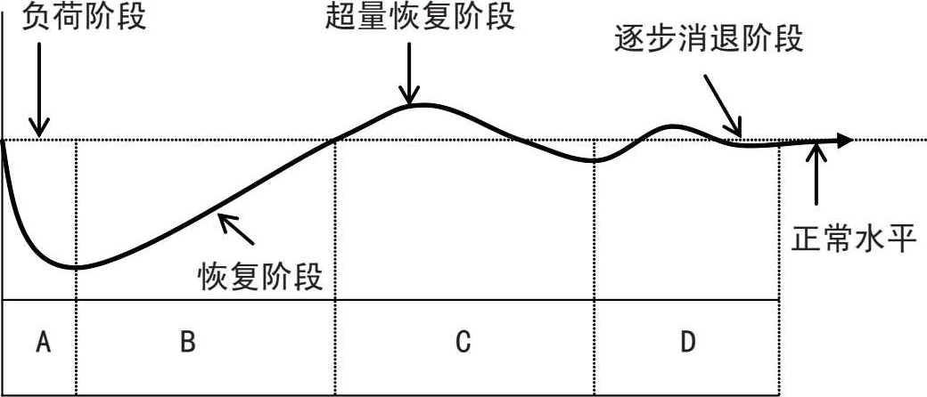 第1阶段,运动时物质的消耗过程占优势,恢复过程虽也在进行,但当时是消耗大于恢复,所以使能源物质减少,各器官系统的工作能力下降;第2阶段,运动后消耗过程减弱,恢复过程占明显优势,这时能源物质及各器官、系统的机能能力逐渐恢复到原来水平;第3阶段,在运动时消耗掉的能源物质及各器官、系统的机能恢复到超过原有水平,这个阶段也叫超量恢复阶段。超量恢复保持一段时间后又回到原有水平。