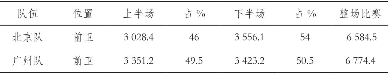 ,对北京与广州队比赛中不同活动方式距离进行了统计分析。从统计结果来看,本场比赛中两队平均慢跑3355m左右,占总距离50.2%;中等以上速度跑1519m,占总距离23%。(表2-6)