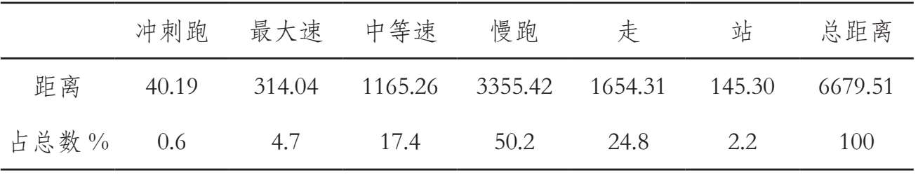 依据J.C.Barbero-alverez(2007年)制订的6种不同活动方式,包括站:0~0.1 m/s;走:0.2~1m/s;慢跑:1.1~3m/s;中等跑:3.1~5m/s;最大速跑5.1~7m/s:冲刺跑:> 7.1m/s
