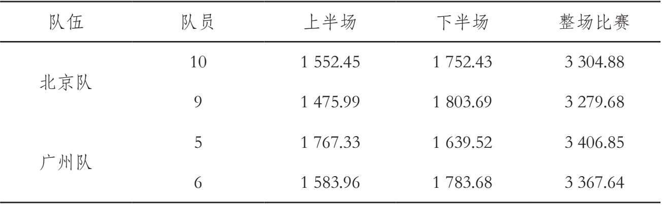 通过记录本场比赛统计对象的上下场时间,计算得出4名队员平均跑动距离为3339.7m。(表2-5)