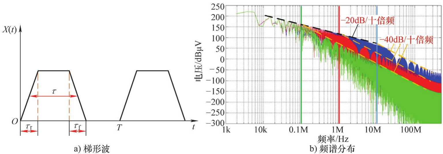高压系统产生电磁干扰的主要原因是功率器件的快速通断产生大的电流变化d i /d t 和电压变化d u /d t ,高压功率器件主要包括驱动电机控制器IGBT、高低压DC-DC变换器和充电机的MOSFET。功率器件的电流等级为200~900A,电压等级为400~1200V,开关频率为10~100kHz。IGBT梯形波及其频谱分布如图2-12所示。关于高压功率器件IGBT和MOSFET通断产生的电磁干扰,将在第3~5章详细介绍。