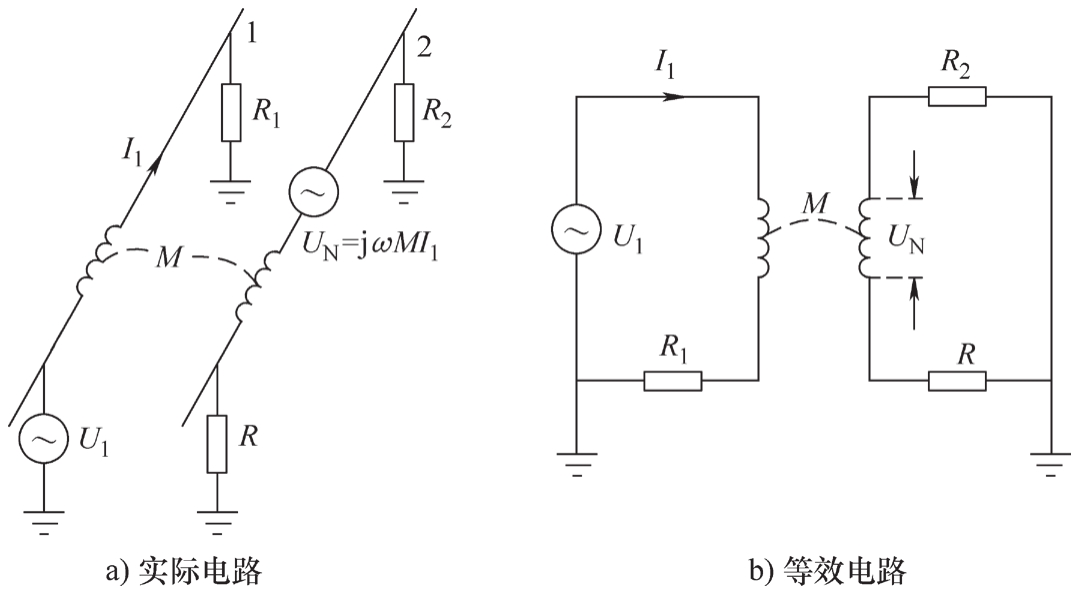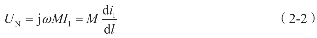 线缆束之间(特别是高低压线束之间)通常存在电感性耦合,电感性耦合是指通过交变电流的导体在其周围会产生交变磁场,进而在周围的闭合电路产生感应电动势。两电路间的电感性磁耦合如图2-16所示, I 1 是干扰电路中的电流, M 是两电路间的互感,噪声电压 U N 为