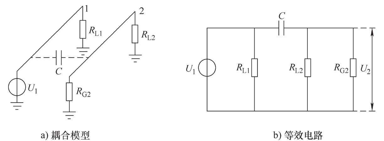 线缆束之间、线缆与金属车体之间和不同空间安装的控制器金属机箱之间,通常存在电容性耦合。电容性耦合是电路间电场相互作用的结果。图2-15a表示一对平行导线间的电容耦合,其等效电路如图2-15b所示。导体1上的电压 U 1 作为干扰源,导体2视为受影响的电路或接收器,导体2与接地之间产生的噪声电压 U 2 可以表示为