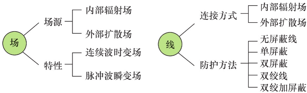 许多电磁干扰是通过电磁场对电缆导线的耦合途径发生的,其耦合机理比较复杂,干扰传播途径也比较隐蔽,包括感应耦合、高频辐射场、孔缝泄漏场对导线的耦合等,场对线可能存在的多种耦合组合,如图2-17所示。