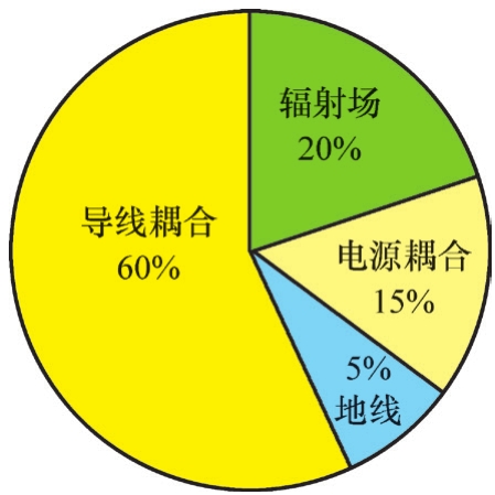 电缆中导线之间的耦合干扰是最常见的干扰耦合模式之一,它是系统内部设备之间进行电磁兼容分析的典型干扰方式。电磁干扰的耦合路径统计结果如图2-18所示。由图可知,导线间的耦合(导线耦合)最为严重,占60%,是电磁兼容设计中必须认真对待的问题之一。