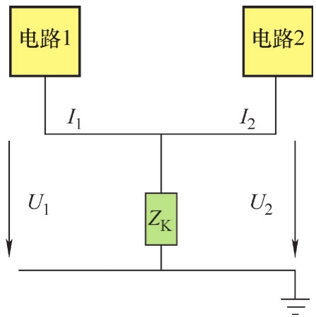 车辆内多个电子电气部件使用同一个车载低压电源或高压动力电池供电,电源的内阻抗及它们所共用的电源线的阻抗就成为这些部件的公共阻抗。如果多个部件使用同一条地线接(搭铁),则地线的阻抗也会成为这些部件的公共阻抗。电路性公共耦合是最常见的传导耦合方式,其中至少存在两个相互耦合的电路。图2-14所示电路就是一种典型的通过接地公共阻抗的传导耦合方式,整车的接地点以及接地方式会影响电路性耦合。