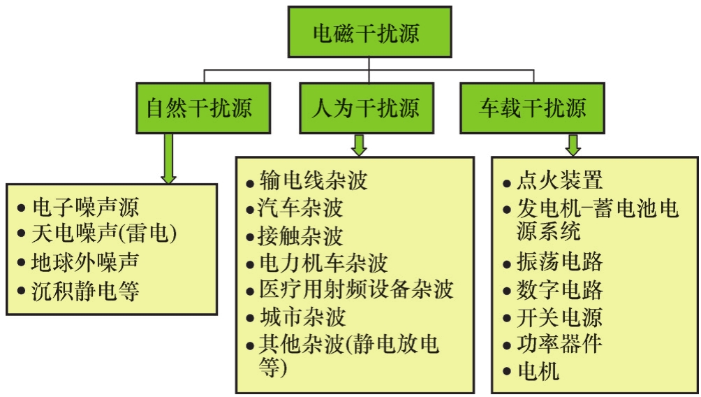 电动汽车的电磁干扰源大致可以分为3类,即车载干扰源、自然干扰源和人为干扰源,如图2-11所示。自然干扰源是指由自然现象引起的电磁干扰;人为干扰源是指由汽车外部人工装置产生的电磁干扰;车载干扰源主要是指车上各种电气系统产生的电磁干扰。下面主要以新能源汽车车载干扰源进行分析,车载干扰源主要有电机驱动系统、动力电池系统、电力电子装置(DC-DC变换器、AC-DC整流器、DC-AC逆变器)、电动辅助系统。电压和电流的快速暂态会产生辐射和噪声,特别是电力电子装置的快速整流、电机起动、高压辐射,更会引起较高场强的传导及辐射干扰。