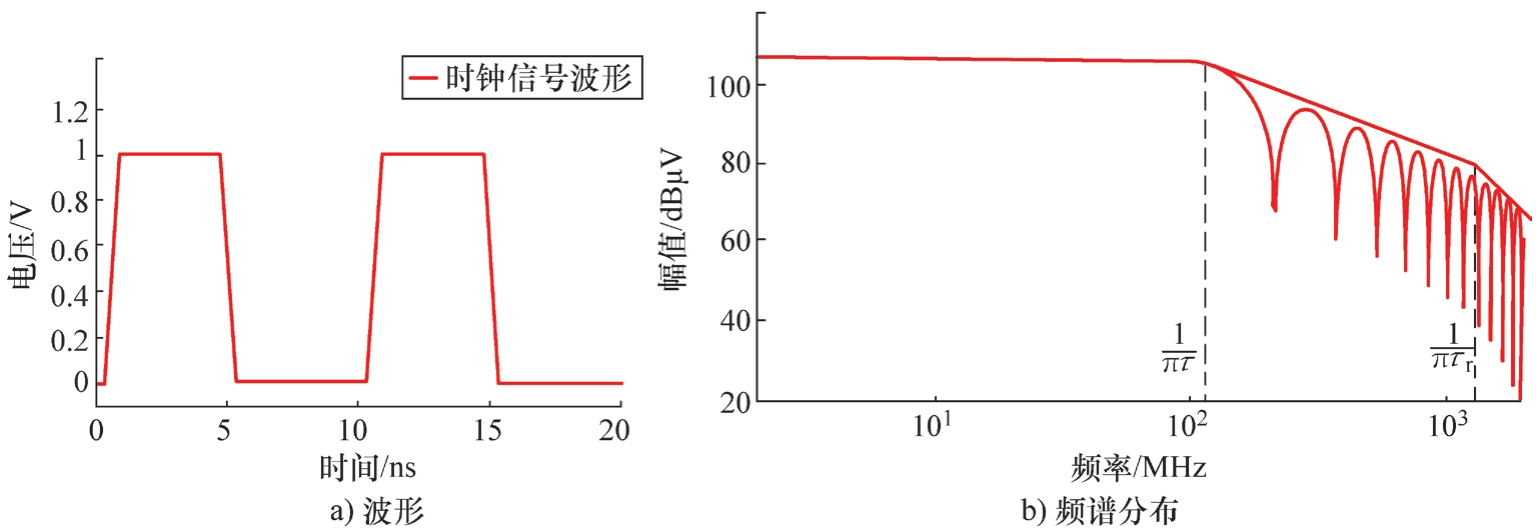 低压控制器如VCU、BMS等电磁干扰源主要是数字芯片高速开关信号、低压电源DC-DC芯片和时钟信号,时钟信号波形及其频谱分布如图2-13所示。此外,低压控制器PCB的电源完整性和信号完整性也必须关注,相关内容将在第6、7章介绍。