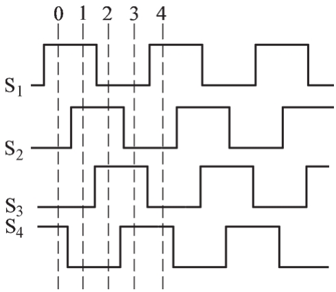 定子的4个绕组按S 1 、S 2 、S 3 、S 4 的顺序输入通电脉冲,就可使电动机逐步(1/32圈)转动。