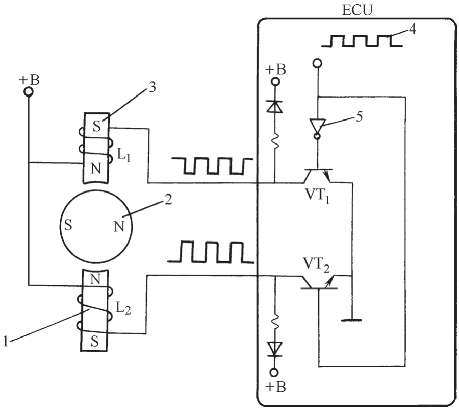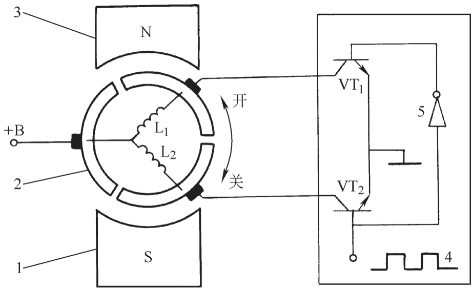 1、3—定子 2—转子(永久磁铁)4—控制信号(占空比信号)5—反相器