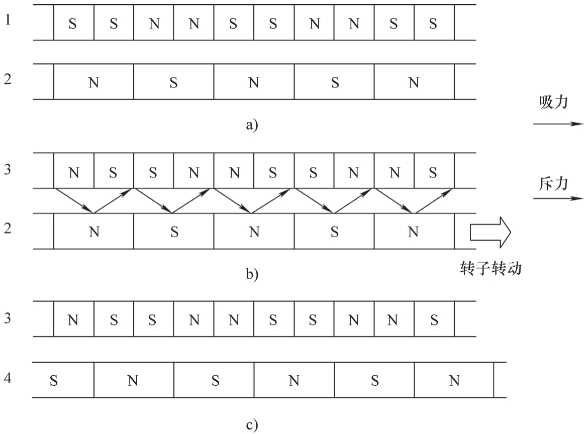 1—转动前定子磁极排列 2—转动前转子磁极位置 3—转动一步定子磁极排列 4—转动后转子磁极位置
