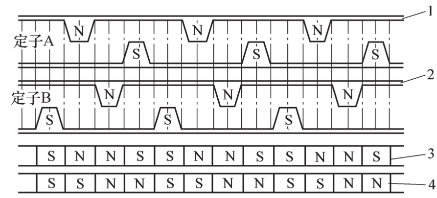 1—定子A 2—定子B 3—S 1 、S 2 通电定子磁极排列 4—S 2 、S 3 通电定子磁极排列