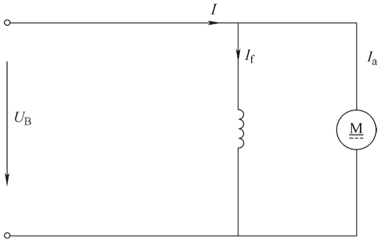 相比于励磁式直流电动机,永磁式电动机结构尺寸小,工作可靠性好,因而在汽车电子控制系统中应用较多。励磁式直流电动机磁极绕组通常采用并联方式,其电路原理如图1-74所示。
