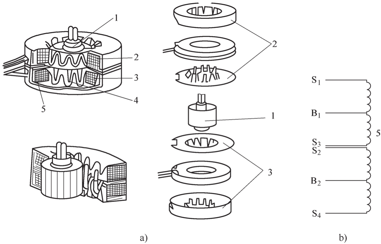 1—转子 2—定子A 3—定子B 4—爪极 5—定子绕组B 1 、B 2 —电源端子S 1 、S 2 、S 3 、S 4 —控制端子