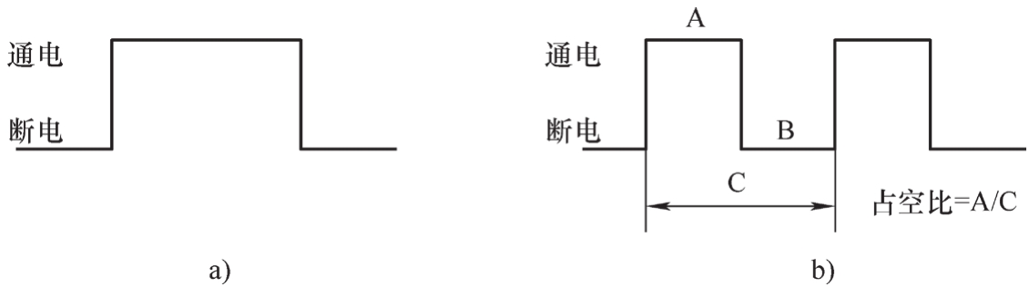 执行机构电磁线圈也只有通电和不通电两个工作状态,但电流以占空比脉冲的方式流经电磁线圈,通过执行机构动作前后比率来实现对目标参量的控制。