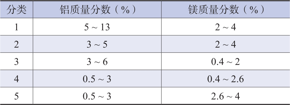 锌铝镁镀层钢板除了在汽车车身应用以外,在对大气耐蚀性要求较高的户外建筑、汽车底盘零件、户外电器外壳等方面也有广泛应用前景。因此,目前存在面对不同需求的锌铝镁镀层钢板。美国材料协会(ASTM)在其标准ASTM A1046M:2017中,将锌铝镁镀层钢板按照镀层成分分为五大类,详见表1-35,用于汽车车身的为第四类锌铝镁镀层钢板。