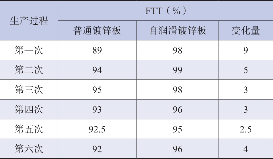 经过批量验证,对比自润滑镀锌板和普通镀锌板的首次合格率(First Time Through,FTT)指标,自润滑镀锌板一次通过率提高较为明显,平均提高4.4%,对比结果见表1-39。