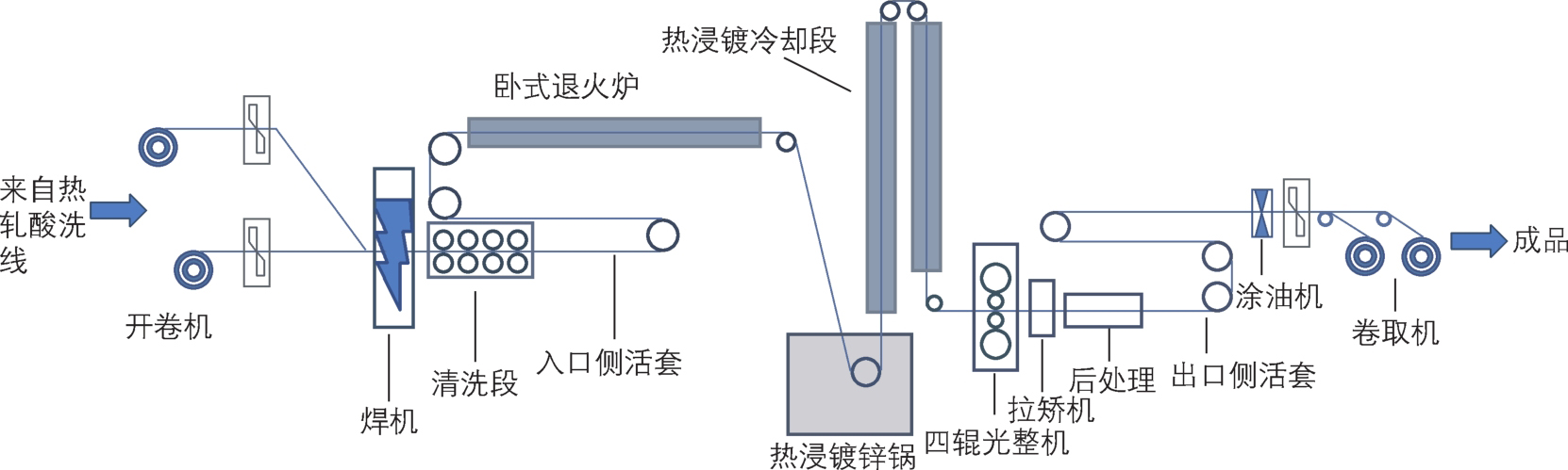 4)冷轧工艺流程:酸洗—轧制—清洗—退火—镀锌—卷取。