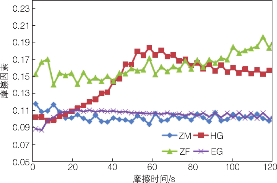 图1-71往复摩擦试验测量的SOZAMVTM锌铝镁镀层(ZM)、传统纯锌镀层(HG)、锌铁合金镀层(ZF)以及电镀锌镀层(EG)的摩擦因数