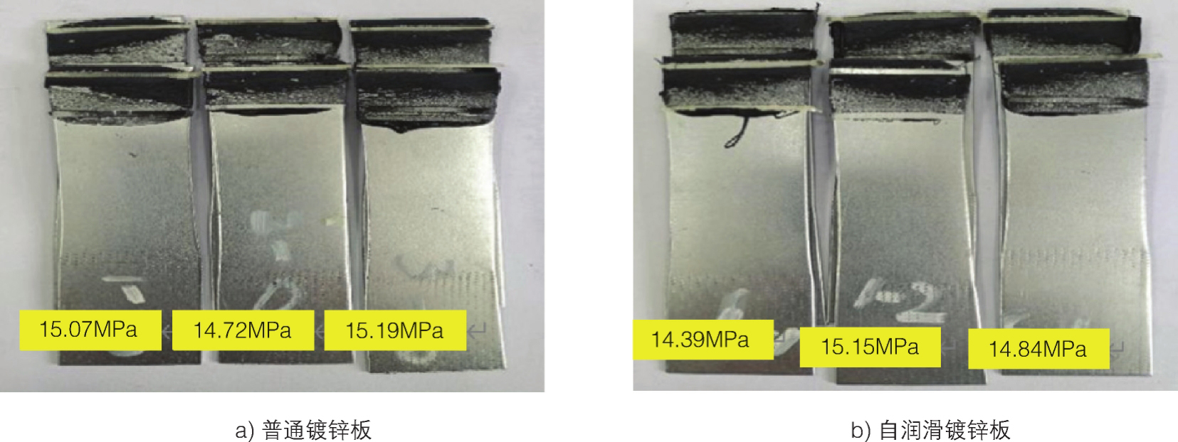 对比两种钢板的胶黏性能(图1-77),自润滑镀锌板胶黏性能稍有降低,剪切强度相差不大。自润滑镀锌板和普通镀锌板整体性能综合对比结果见表1-38。对比发现,自润滑镀锌板综合性能表现更加优异,可以代替普通镀锌板。