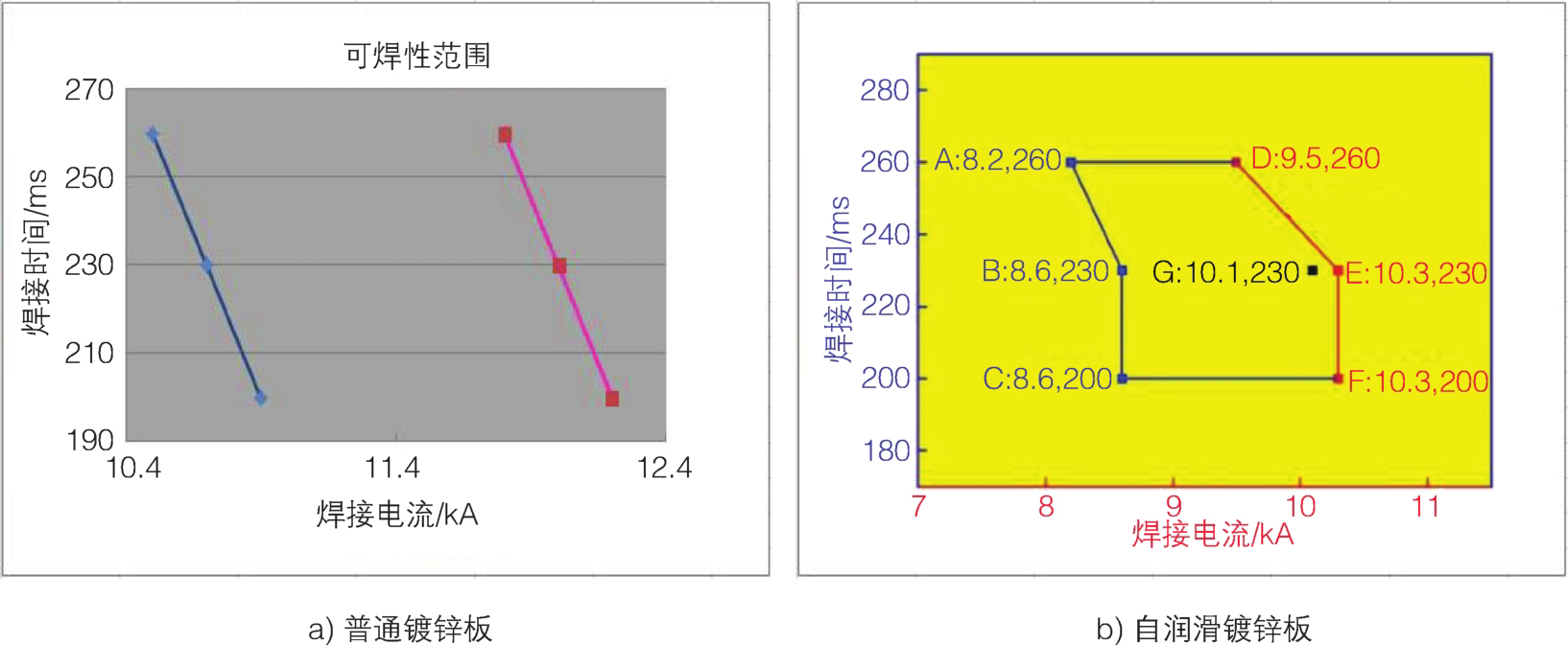 相比普通镀锌板,自润滑镀锌板可焊电流范围有一定程度下降,如图1-76所示,但二者可焊电流范围均大于1.2kA,满足一般主机厂要求的大于1.0kA使用要求。