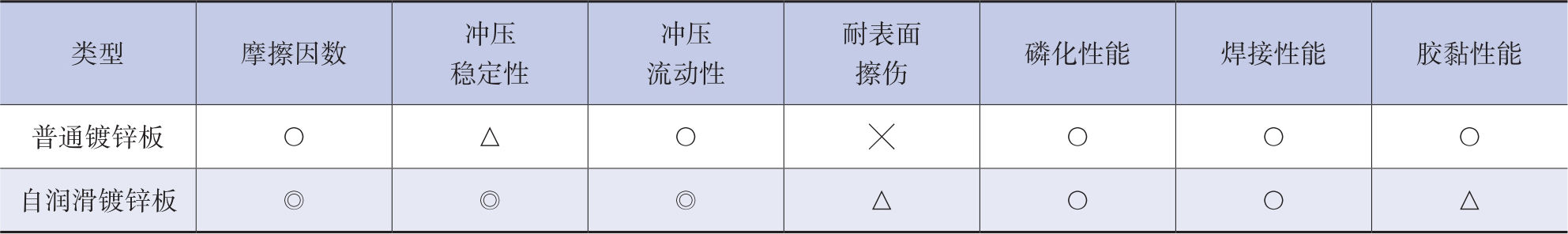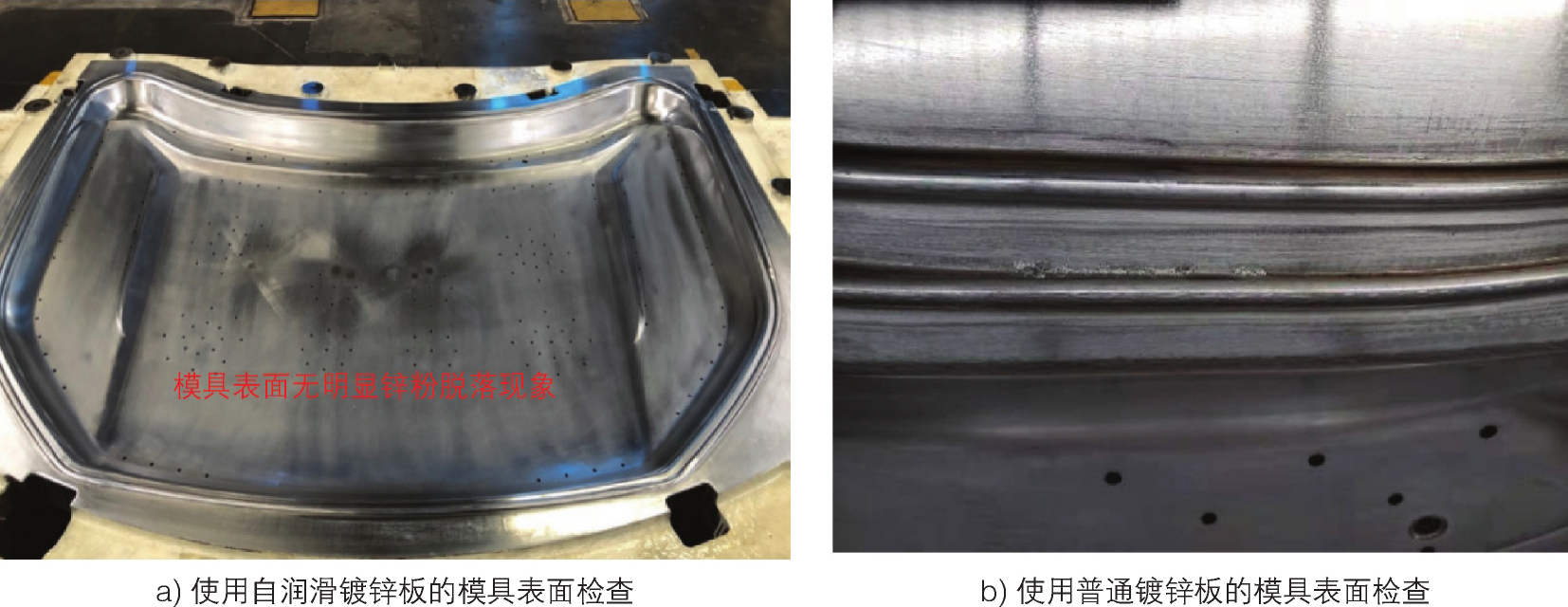 传统镀锌钢板在冲压过程中表面容易掉脱锌粉,导致零件表面缺陷。自润滑产品在现有的镀锌产品表层涂覆一层具有润滑功能的薄膜,使得镀锌板具备更好的润滑功能性,能减小板料和模具之间的相互摩擦,有效改善冲压脱锌粉问题,同时该层物质不影响后续的涂装、焊接等工序。在倡导绿色节能、可持续发展的背景下,自润滑镀锌钢板对于提高车厂劳动效率、减少锌资源的浪费方面相比传统的无表面处理的镀锌板具有更加广阔的应用前景。