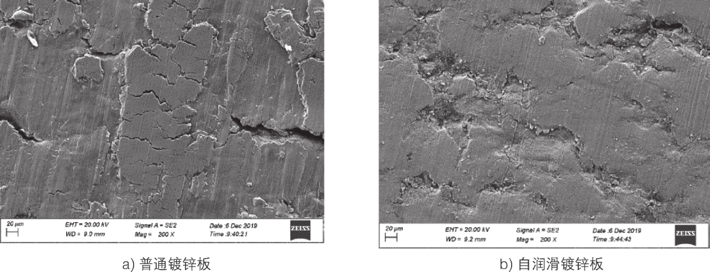 非自润滑产品表面锌层经摩擦后表面锌层出现明显裂纹并伴有轻微锌层脱落现象,自润滑处理钢板表面锌层仍保持均匀、致密形态,对比结果如图1-74所示。