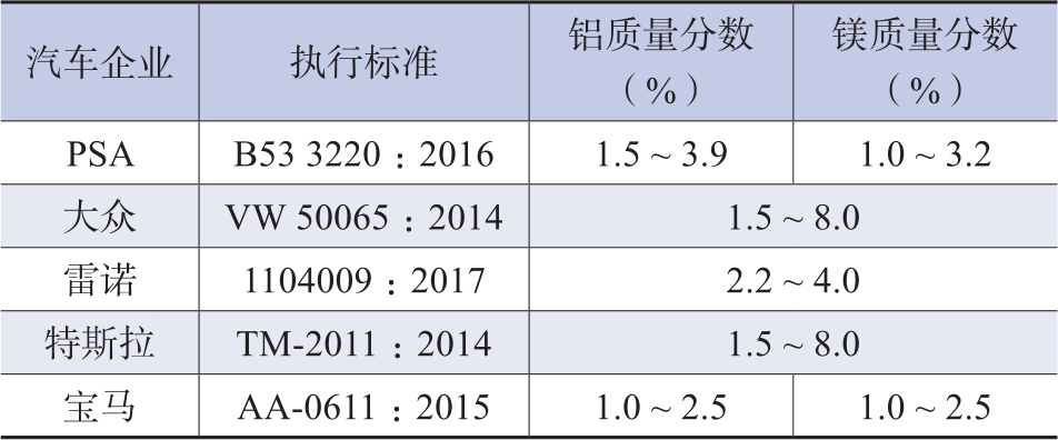 在目前汽车企业应用的锌铝镁镀层中,铝含量和镁含量均不超过4%。不同汽车企业对锌铝镁镀层钢板的镀层成分要求不太一样,具体要求见表1-34。在德国汽车工业协会(VDA)的团体标准VDA 239-100:2016中,要求锌铝镁镀层中铝的质量分数范围为1.0%~3.0%,镁的质量分数范围为1.0%~2.0%。