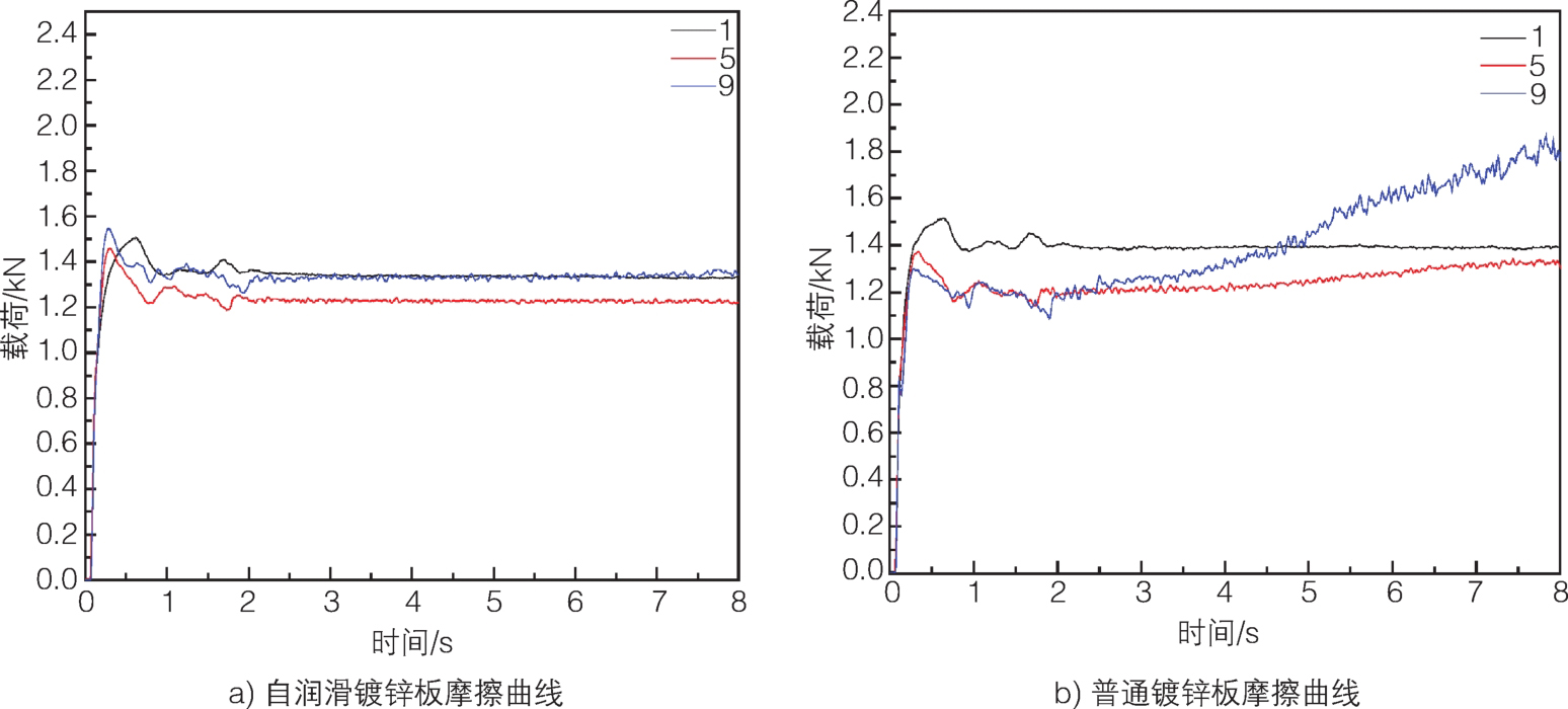 自润滑镀锌板表面涂覆一层有机自润滑膜后,在平面滑动试验过程中载荷波动明显变小,平面润滑性能得到改善,试验结果如图1-73所示。