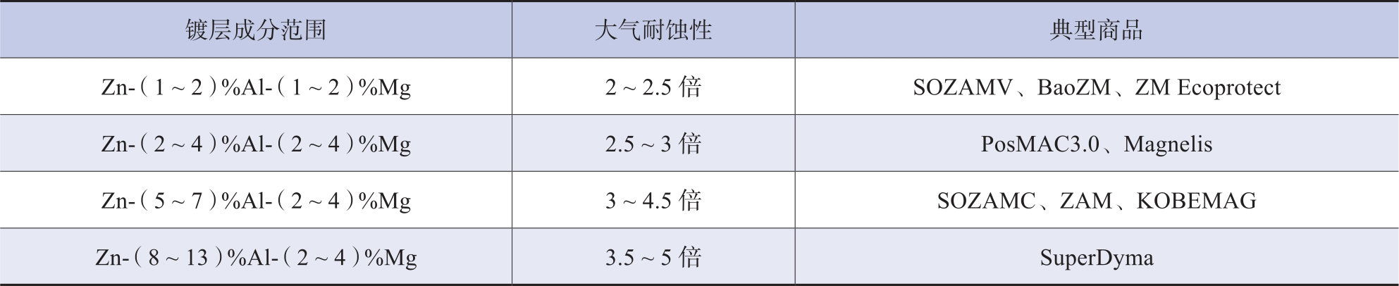 表1-33典型锌铝镁镀层钢板的大气耐蚀性