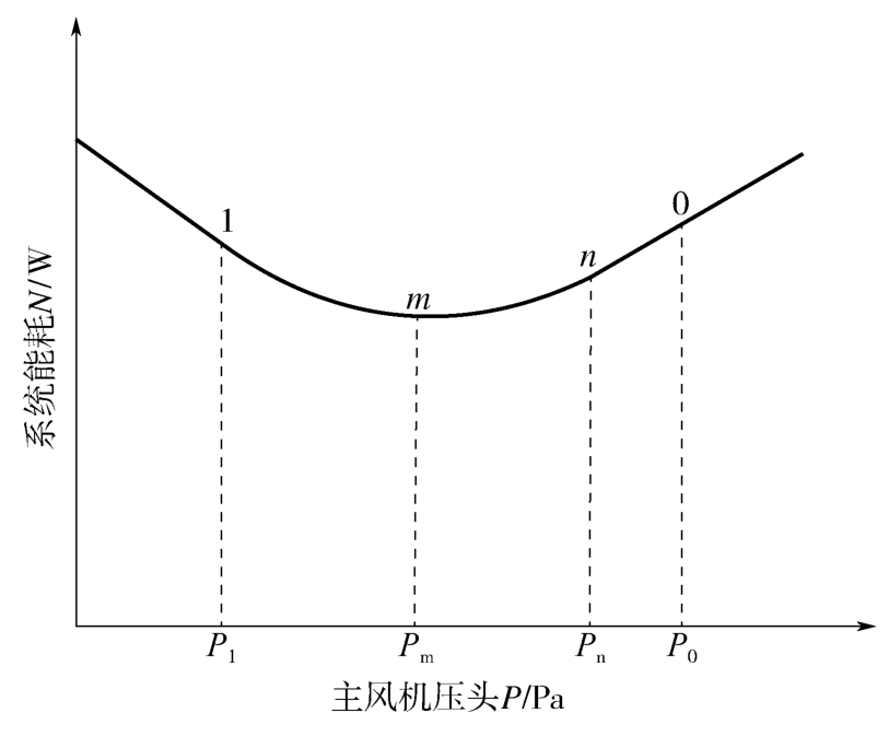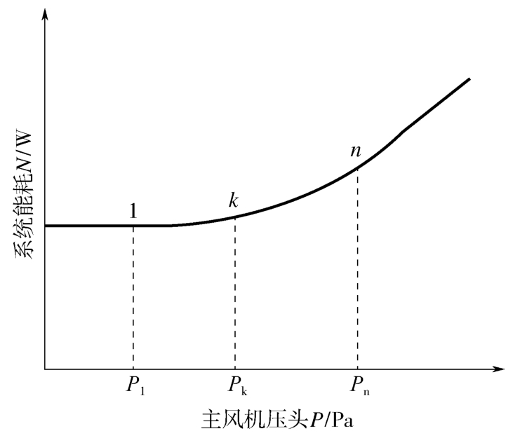 从式(3-6)得出,系统能耗与主风机风压 P 的选择密切相关,主风机风压 P 的不同,系统配备不同的输配调节方式,致使系统输配能耗发生变化。分析系统能耗与主风机压头之间的变化趋势关系如下: