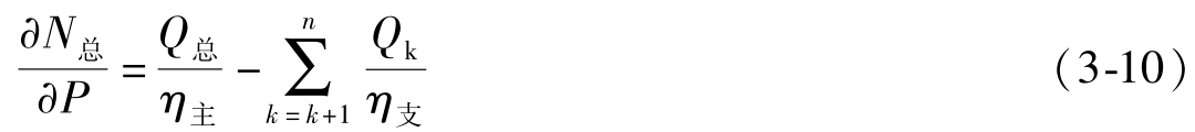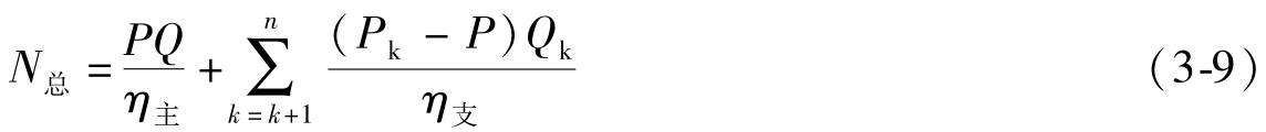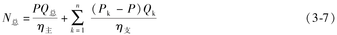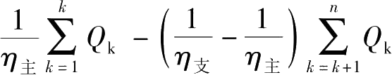 2)当 P 1 ≤ P k ≤ P < P k+1 ≤ P n ,主风机压头只能满足部分环路阻力损失,即只能满足环路1至环路 k 的阻力损失,环路 k +1至环路 n 的不能满足,需增设支路风机,计算系统能耗时需计算环路 k +1至环路 n 的支路风机能耗。故系统能耗为: