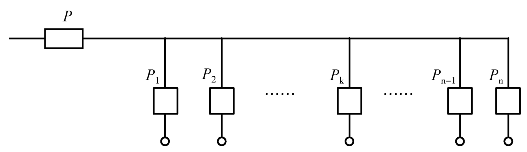 图中 P 1 、 P k 、 P n 为环路1、环路 k 、环路 n 的阻力损失,环路 n 代表系统最不利环路, P 1 ≤ P k ≤ P n , P 1 、 P k 、 P n 为主风机压头 P 的可能取值。