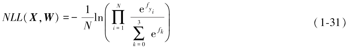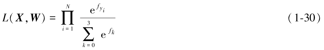 图1-34中Sofmax层输出4个概率值,代表的是在当前模型和输入样本的条件下,预测输入样本属于各个类别的概率。因为是有监督学习,故通过真实值可知这个样本对应的类别 y i 等于1,训练的目标就是让模型从标签为1的输出端输出概率最大,这样预测的分类才是正确的。在最理想的情况下,标签为1的输出端输出概率为1.0,而其他3个输出端均输出0,在实际情况下这几乎是不可能的。如果把所有训练样本都考虑进去,希望模型所有样本真实值对应的输出概率是最大的,于是可以使用极大似然函数(Maximum Likelihood Function)来构造优化问题: