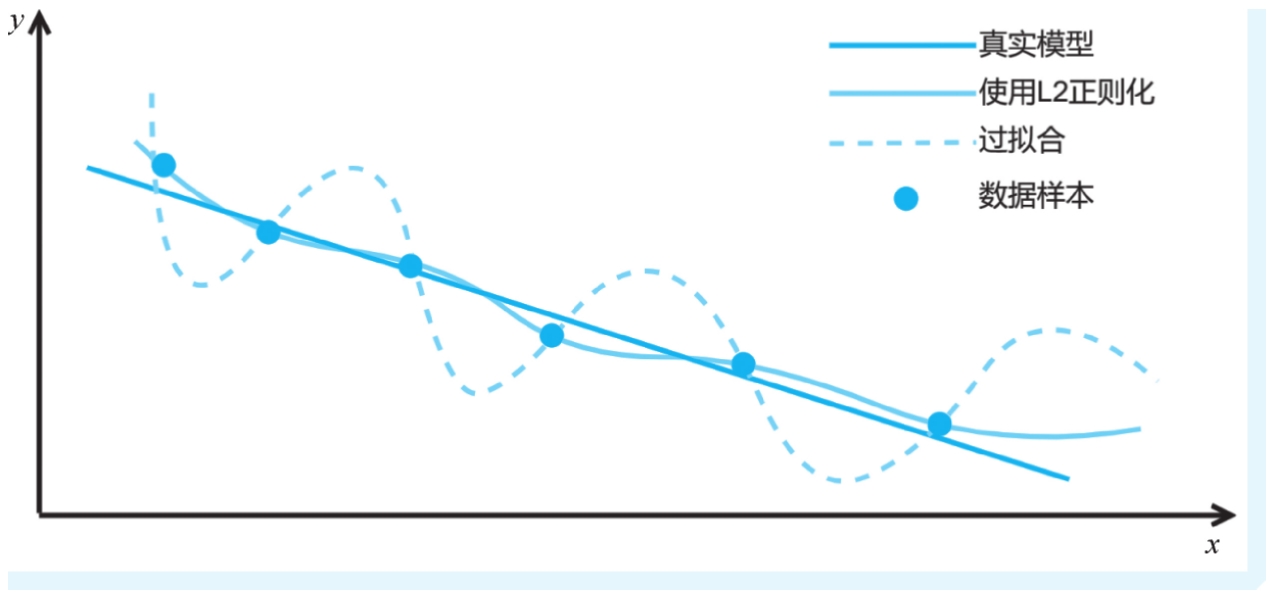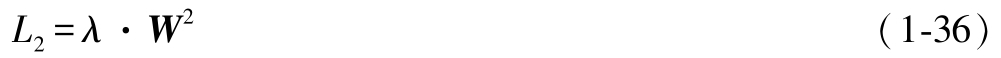 式中, λ 是控制正则化强度的系数, λ 越大则正则化的力度越大; W 是神经网络的权重。从式(1-36)可以看出来,权重值越大,L2正则化损失就越大。而优化的目标是让损失变小,所以在优化算法的作用下,这个L2正则化损失会让模型的权重值越变越小。那么为什么L2损失可以防止模型过拟合呢?从不同的角度出发,有很多种解释的方法。