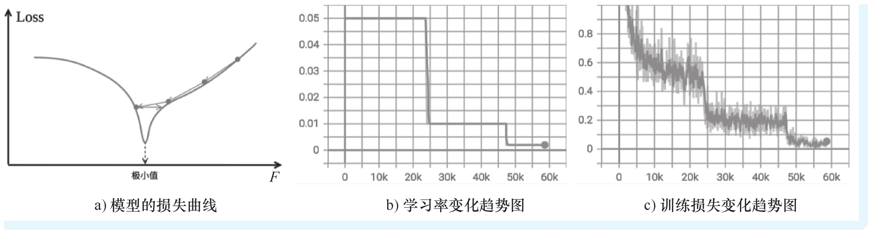 如果不降低学习率,模型几乎没有可能达到极小值。如果按照图1-41b中学习率变化趋势图所示的规则降低学习率,训练损失值就会呈现出图1-41c所示的变化趋势,在学习率降低的瞬间,损失会陡然降低。这是因为模型下探到了损失曲线中更陡峭、更低的谷底。