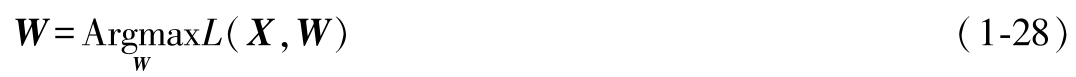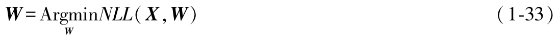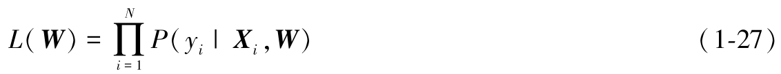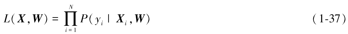 式中, P 指的是第 i 个样本 X i 的真实值标签 y i 对应的输出概率,也就是图1-34中标签为1的概率。公式的含义是所有样本真实标签对应的输出概率的联合概率,所以是 N 个样本的概率相乘,这个联合概率一般被称之为似然(Likelihood),常用字母 L 表示。训练样本和其真实值标签都是给定的,只有神经网络的权重 W 是变量,因此 L 是 W 的函数。最理想的情况下,神经网络在每一个样本的真实值对应的输出端都输出1.0,那么式(1-27)中的联合概率等于 N 个1.0相乘,便得到理论最大值1.0。